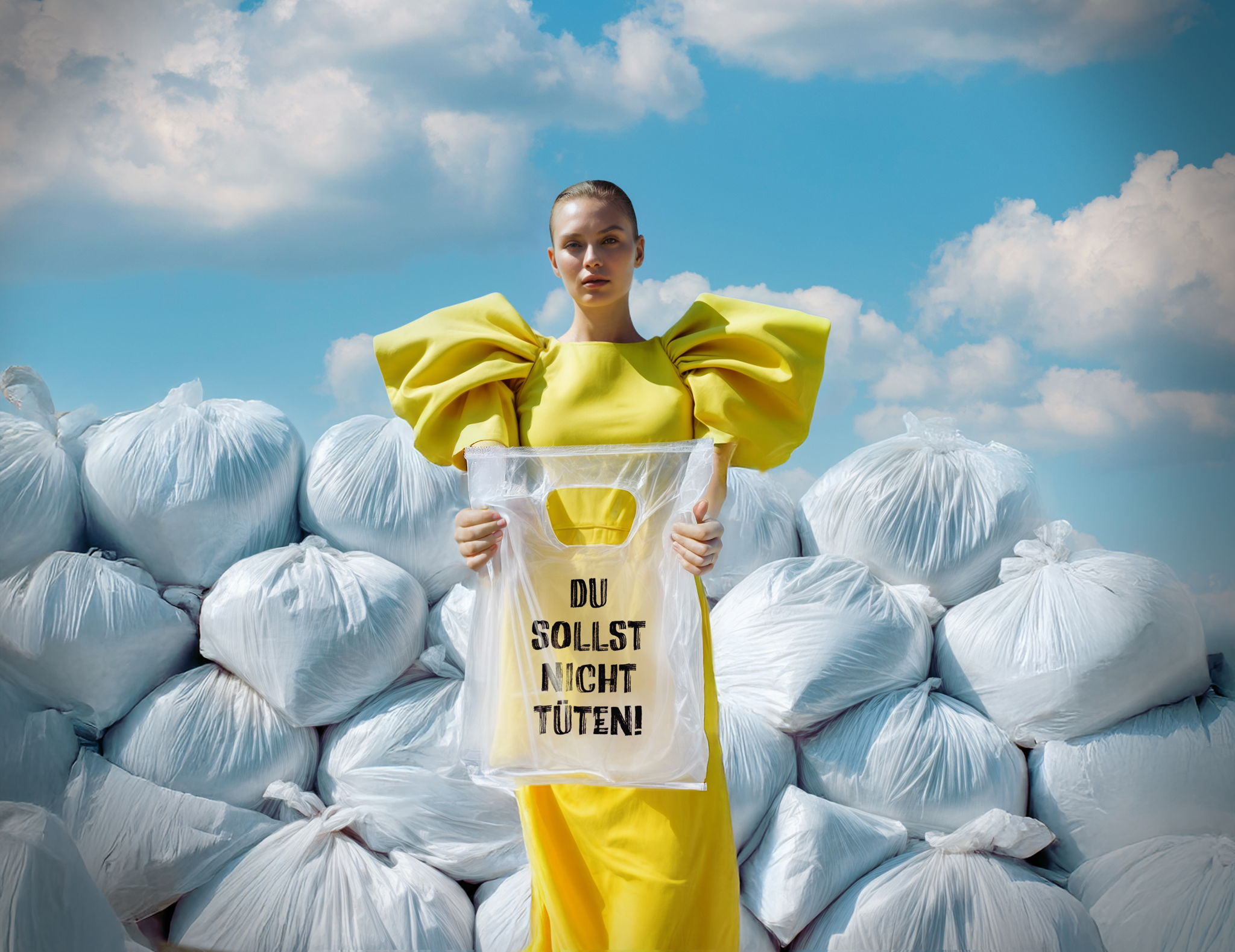 This piece is a blend of my work in marketing and my artistic side. The text "DU SOLLST NICHT TÜTEN!" is something I came up with myself—it’s a twist on the commandment "Thou shalt not kill," turning it into a message about plastic waste. It reflects the tension between consumption and sustainability, something I deal with daily in my professional life. The boldness of the design, mixed with the thought-provoking message, shows how my creative and advertising worlds collide.