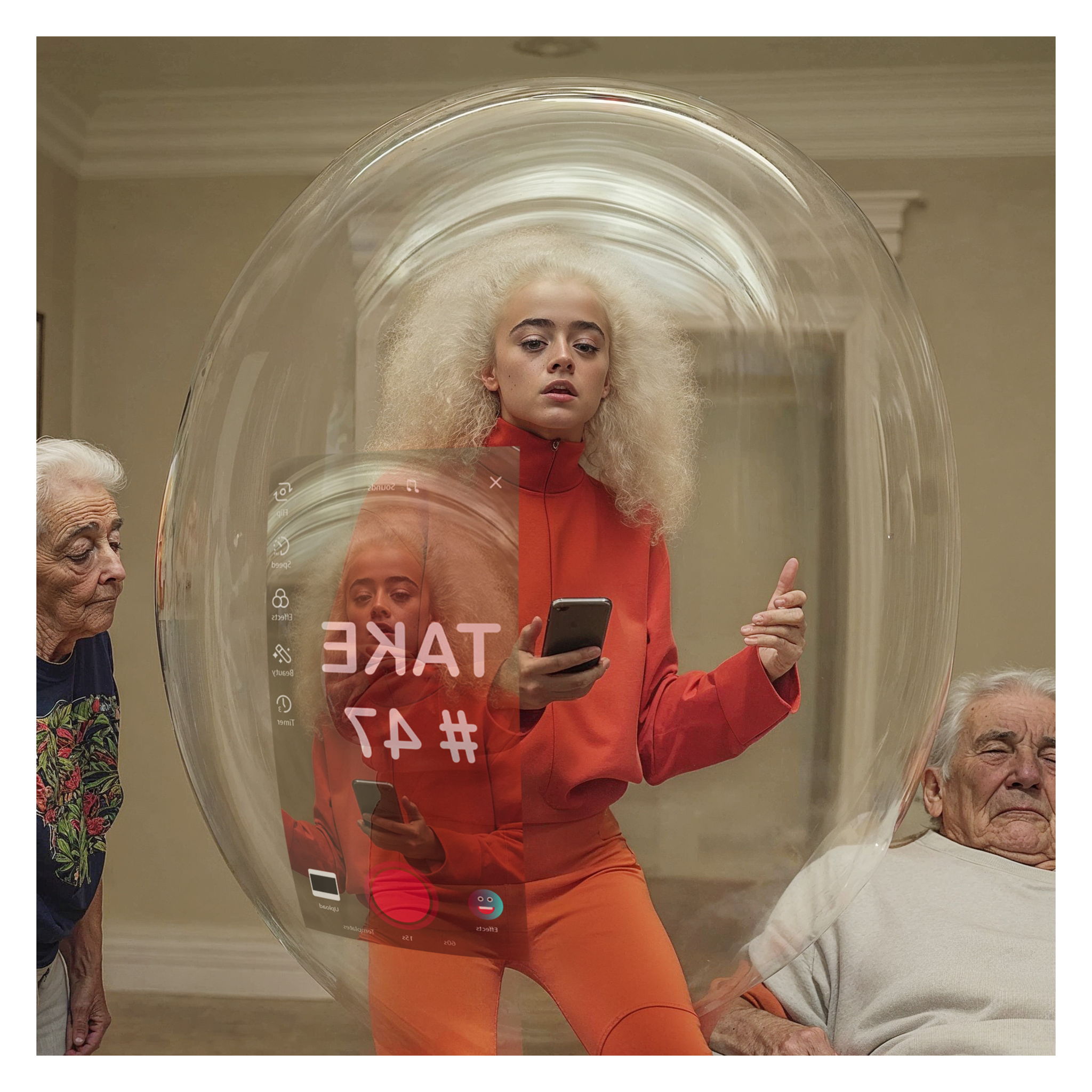 Through a transparent bubble, we observe a young TikToker lost in her digital performance, while her grandparents doze off beside her, their gentle attempts to connect fading into her self-made boundary. A visual reflection on how questionable priorities might lead us to disconnect from authentic moments.