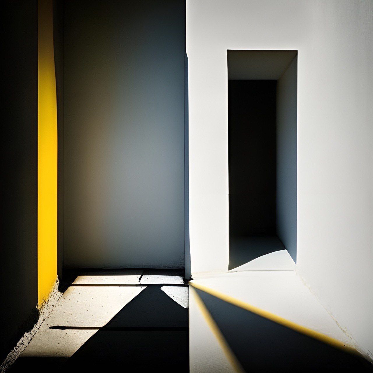 I aimed to capture the striking interplay between light, shadow, and geometric forms in architectural spaces. The composition juxtaposes stark contrasts - a vivid yellow glow against deep blacks, smooth white surfaces beside textured shadows. The rectangular openings create a sense of depth and mystery, inviting the viewer to contemplate what lies beyond. The sharp angles and clean lines evoke a feeling of modern, minimalist design while the dramatic lighting adds an element of drama and intrigue. I sought to explore how light can transform and define spaces, creating new geometries through illumination and shadow. The title "Edges of Light and Shadow" reflects this core theme - the boundaries where light and darkness meet, shaping our perception of form and space. This piece challenges the viewer to see familiar architectural elements in a new way, appreciating the abstract beauty that can emerge from thoughtful framing and lighting of everyday structures.