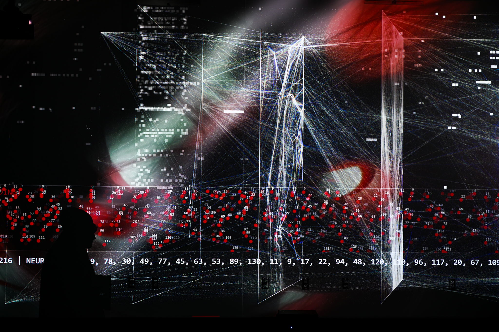 The work is built as a real-time, multi-layered A/V system. The core visual composition runs in TouchDesigner, with spatial audio composed and performed in Max/MSP. Brain organoid activity is streamed and analyzed by a custom JavaScript application, which extracts features from spike trains and sends control data to TouchDesigner and Max, orchestrating all layers of the installation in real-time. For generative elements, we used Stable Diffusion 2.1 within a distributed AI diffusion pipeline, and built control interfaces and simulations in React.js, JavaScript, Unity, and Processing. Networked communication across machines and locations relies on MQTT (via SHIFTR), which was crucial for keeping multiple visual layers synchronized at a final resolution of 10,560 × 2,160. The performance ran in two locations simultaneously: Toronto and Santa Barbara. The installation operates as a closed-loop system between brain organoid data and human biodata. During a live performance in Toronto, EEG signals from a performer—recorded with Biomeci’s "Source" device while she viewed the organoid spikes through custom-made glasses with LEDs—were sent back to the transLAB installation in Santa Barbara, modulating the evolving audiovisual composition and completing the feedback loop.